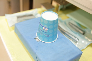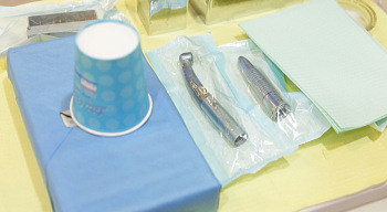 診察・治療に用いる基本セットは、写真のように消毒済み滅菌パック内に保管、使い回ししないディスポーザブル用紙で梱包して診察チェアへお持ちいたします。
