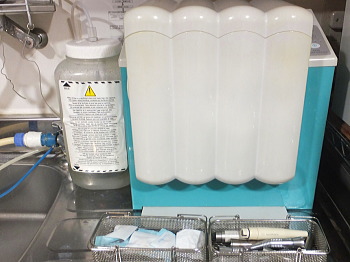 左はドリル自動洗浄器(Quattrocare 2104A)治療用ドリルについて、手では扱えない部分までオイルと自動ディスペンサーで完全に洗浄します