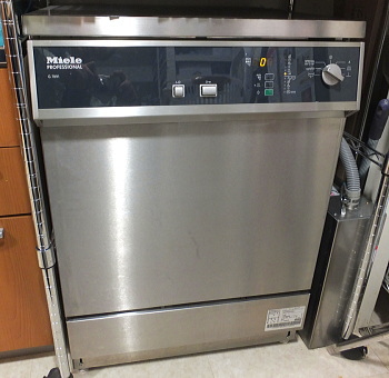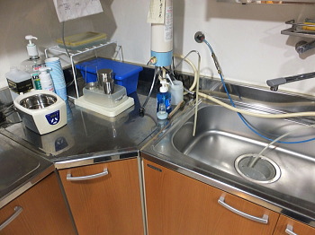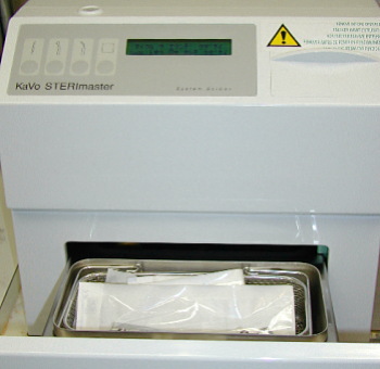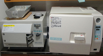 上側、ドイツのMiele社の洗浄除菌自動洗浄機。素手では取扱えない高温(93℃)の熱水・高圧洗浄が可能。横は高圧蒸気滅菌器(kavo STERImaster)