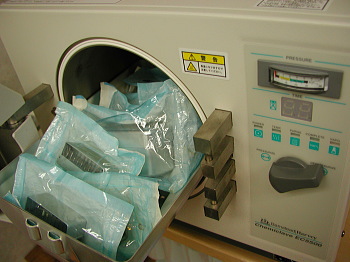 患者さまのお口に入ったものはすべて滅菌、殺菌します(ホルマリンガスによる殺菌:121℃で40分間)。また、お口の中で歯に風をかけるノズルは、患者さまごとに取り替えてホルマリンガスで殺菌しています。また、当医院の歯を削るドリルはすべて、汚染されたエアーの吸い込みを防止する2重サック・バック方式の逆流防止機構が備え付けられている最先端のドリルを使用しています。
