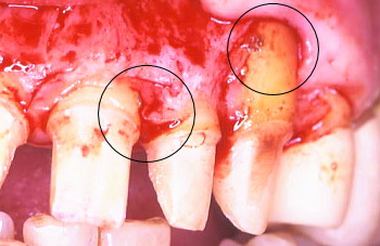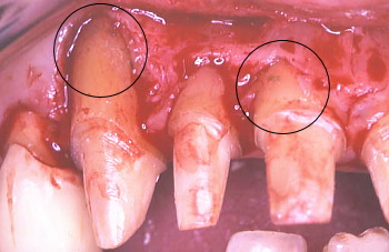 E 骨が異常に吸収しているので歯冠が長く見える。また歯の根っこの表面に歯石が見られ、これが存在する限り、歯周病はよくならないのでこれを取り除くのも一つの大きな外科の目的である。○印で示しているのは歯周ポケットの中で歯根面に付着していた歯石である。