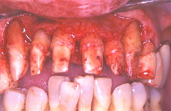 重度に進行した歯周病は外科的に処置を加えないと治療できない場合があります。その主な目的は、深くなった歯周ポケットの切除、深い歯周ポケットの中の歯根面に付着した歯石の除去、歯周病により、デコボコになった歯肉下の骨を綺麗(滑らか)にすることです。以下に外科処置の詳細および各治療ステップを示していきます。