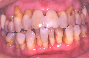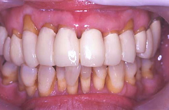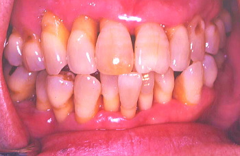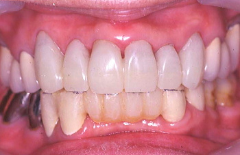 B 上の前歯は少しぐらぐらするので、歯と歯の間をボンドで止め固定した。患者の熱心な歯磨きにより前回よりいっそう歯肉が引き締まり健康になった。しかし歯周ポケットは深いままなので外科によりポケットを除去しなければならない。この状態は治ったように見えるが、これは見せかけの治癒で本当は完治していない。 |