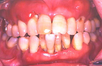 @ 初診時の口腔内の状態:歯と歯の間に黒い歯石が見られ、歯肉は腫れている。 |