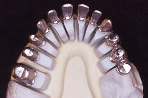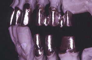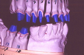 患者さまの過去の写真を参考に石膏模型上のワックスで最終的に入れるクラウンを再現。理想的な型を作り審美を追及した