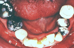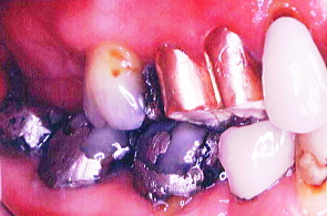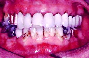 初診時の正面観と初診時の口元。右上の写真、歯が欠けているのがわかる。下は初診時の口腔内の状態。いたるところに虫歯が見られる。