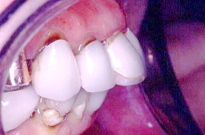 上下歯列を噛む面から見たところ。初診時の前歯を横から撮った写真(右の写真)。かなり出っ歯になっているのがわかる。